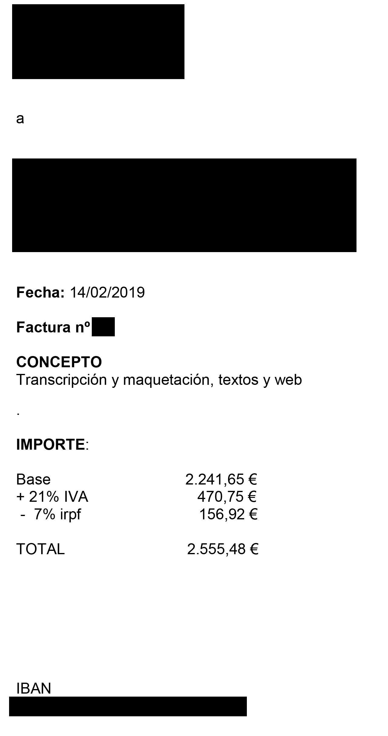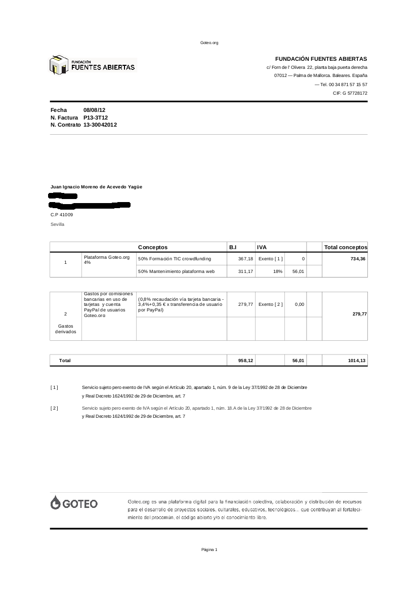 – Comisión del 4% de Goteo.org : 734,36 € (factura que se emitirá por la Fundación Fuentes Abiertas a nombre de la persona o entidad que firma el contrato)