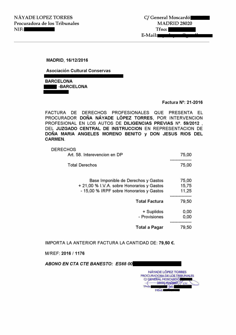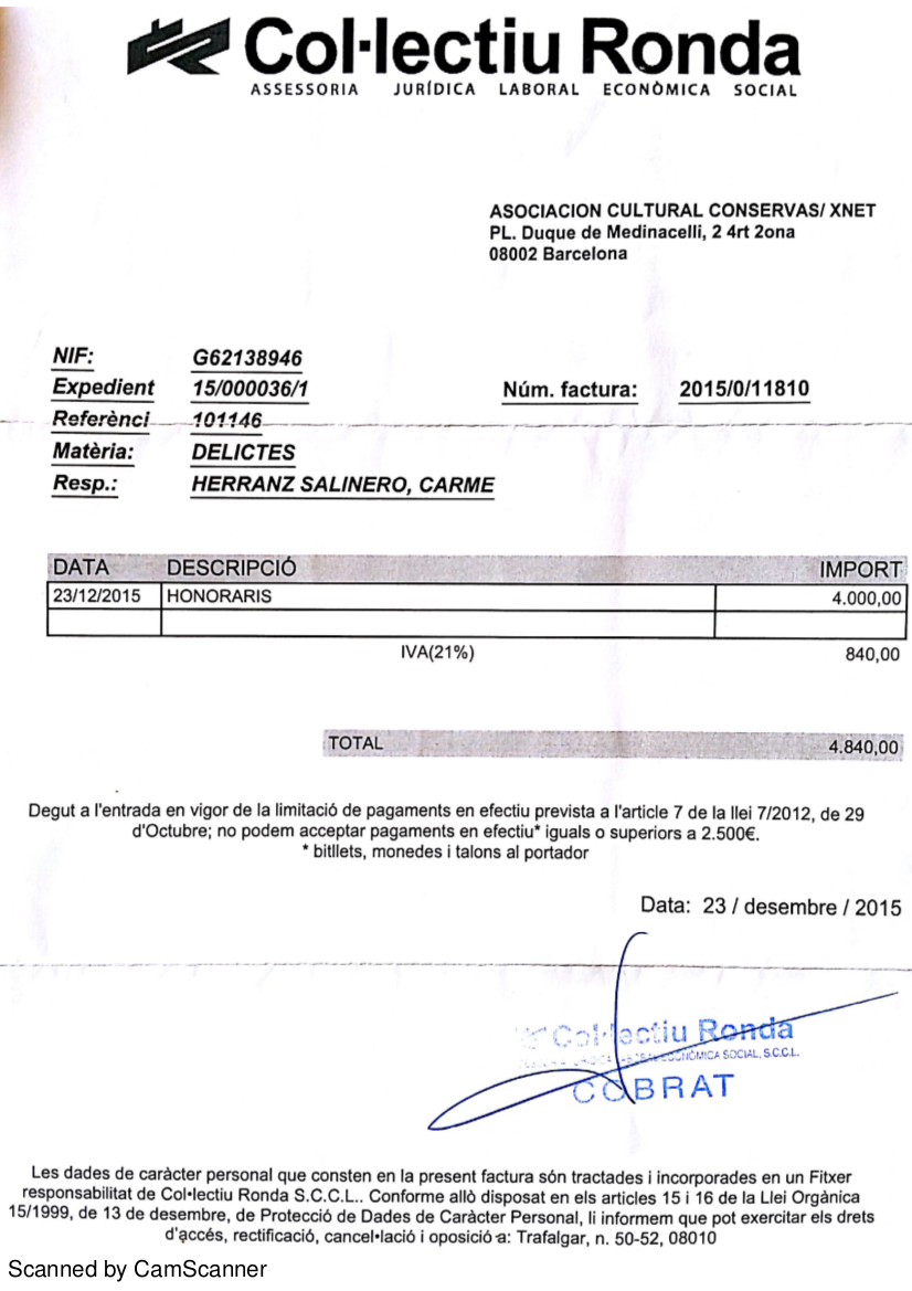 | Honorarios abogados Col·lectiu Ronda + Desplazamientos (23/12/2015) |